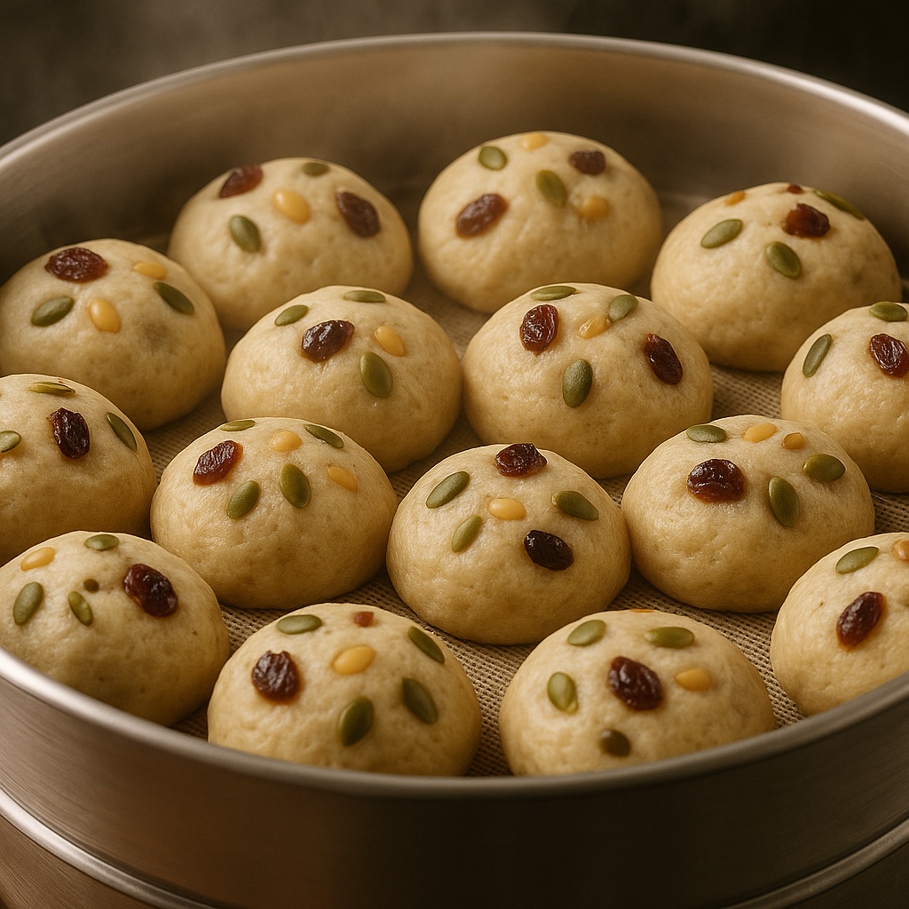 Mix flour, sugar, and salt with Makgeolli. Let it rest in a warm space for 4-6 hours until the dough doubles in size. Pour into a mold or bowl, and steam for 30-40 minutes. The result? A softly tangy, bouncy bread rich in flavor and gut-friendly bacteria.