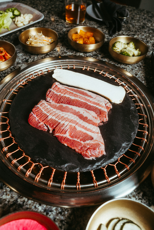Korean pork belly BBQ — grilled at the table. No spicy marinade by default, so it's perfect for first-timers. Enjoy it with dipping sauces and fresh lettuce wraps. Interactive and social — ideal for group dining.