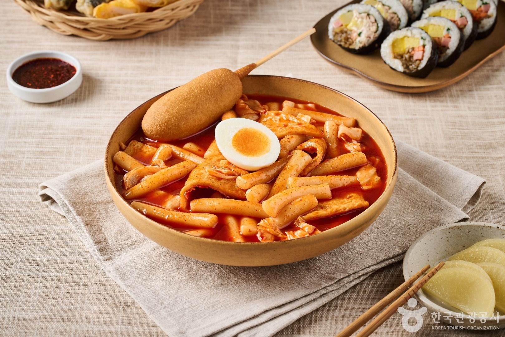 - Tteokbokki (떡볶이): Soft rice cakes in a sweet and spicy gochujang-based sauce. Try rose tteokbokki if you prefer creamy and less spicy flavors.