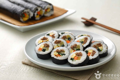 Korea’s beloved rice roll — filled with colorful vegetables, egg, and optional meat or tuna, all wrapped in seaweed. It’s not sushi — no raw fish here — but it’s just as photogenic and delicious. Easy to eat, perfect for a quick lunch or picnic!