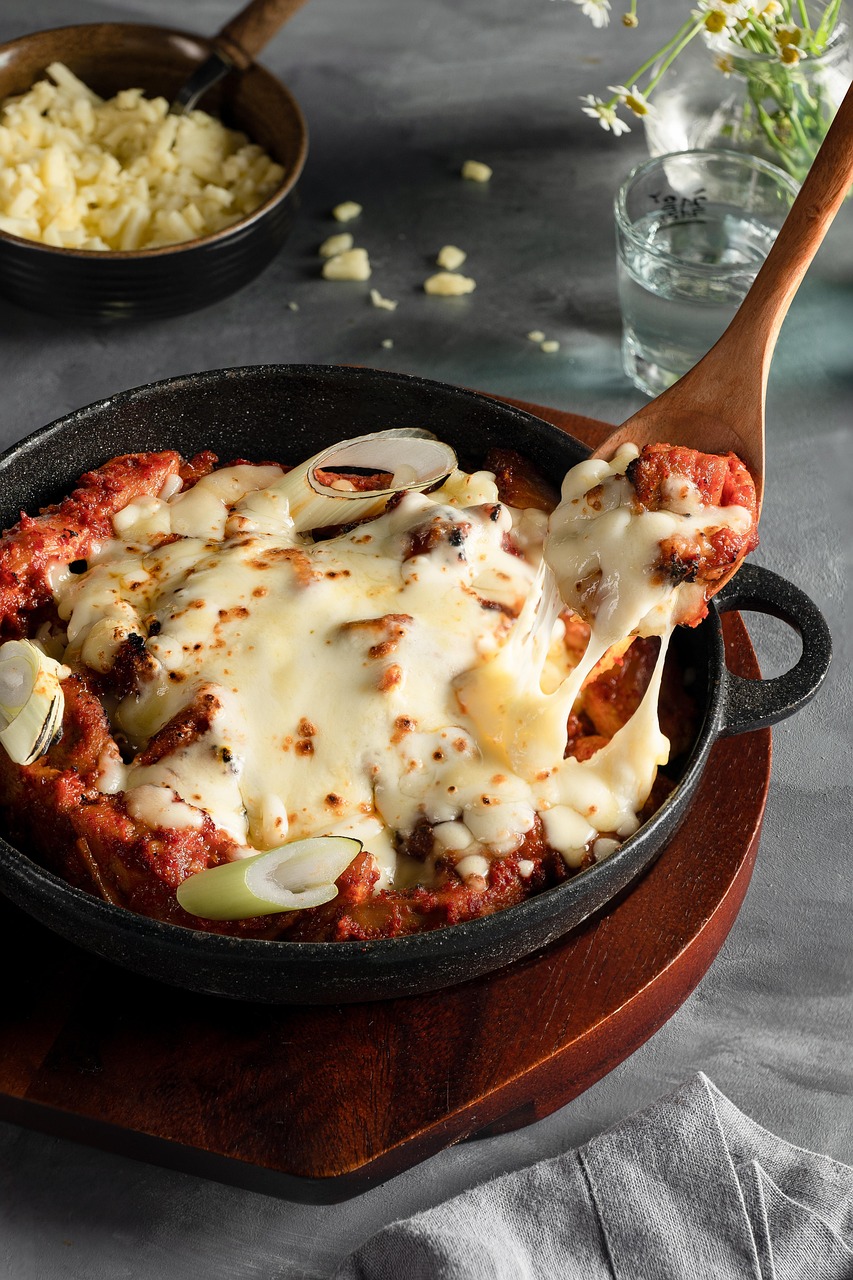 Inspired by the popular spicy chicken dish called "buldak," this tteokbokki variation is loaded with intense heat and cheese. The sauce features gochugaru (Korean chili flakes), soy sauce, and honey for a balance of spicy, savory, and slightly sweet flavors. Mozzarella cheese melted on top helps to mellow the heat while adding a satisfying stretch.