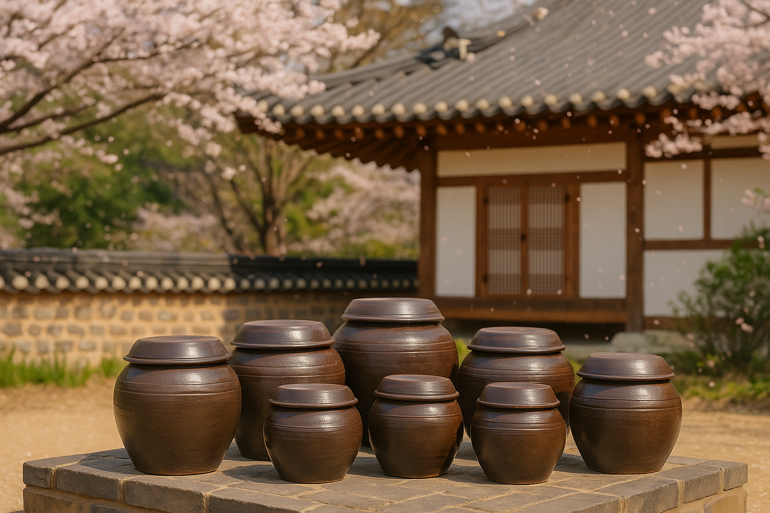 In traditional Korean homes, large onggi jars were often kept outside in a designated corner of the yard, called a jangdokdae (장독대). They held: